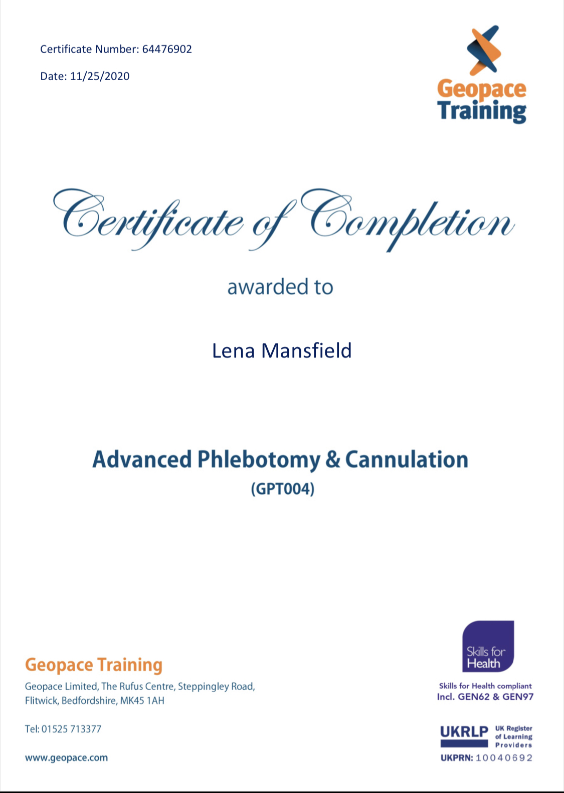 | Lena Mansfield | Beds | 1 | Certificate Competance | Certificate Attendance | More... |